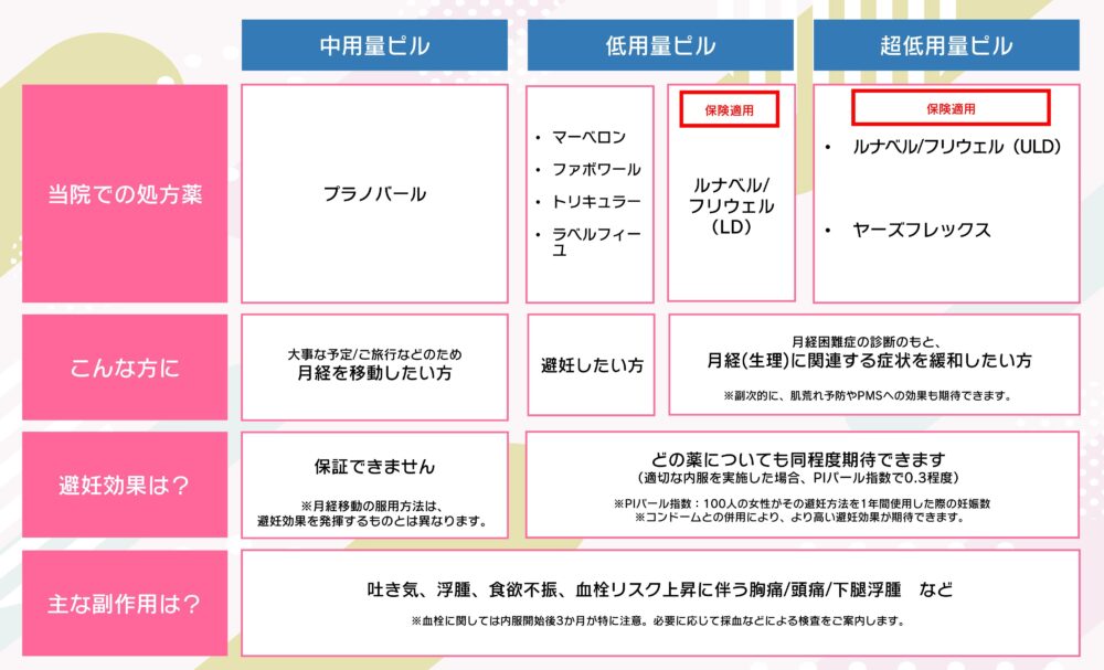 なお、低用量ピルで月経を移動する事もご相談にのることができます。お気軽に。